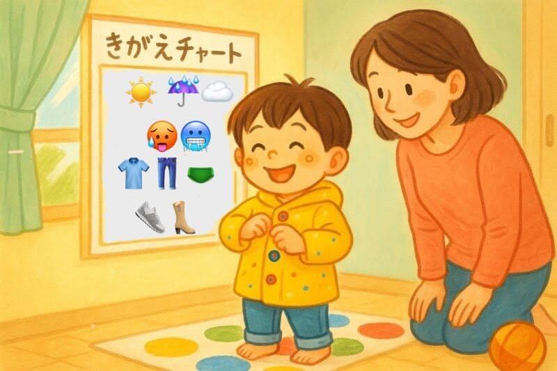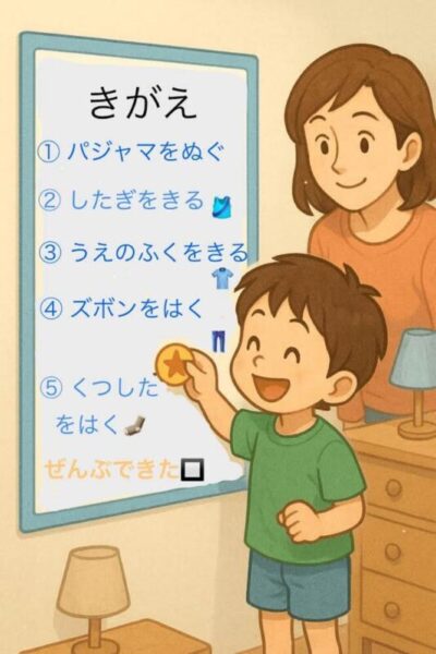 ステップボードや着替えカードを活用し、自分で進められる環境を作ると効果的です。