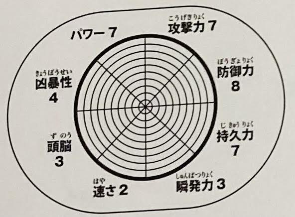 - 「攻撃力・防御力・頭脳・スピード・凶暴性」などが レーダーチャートで表現